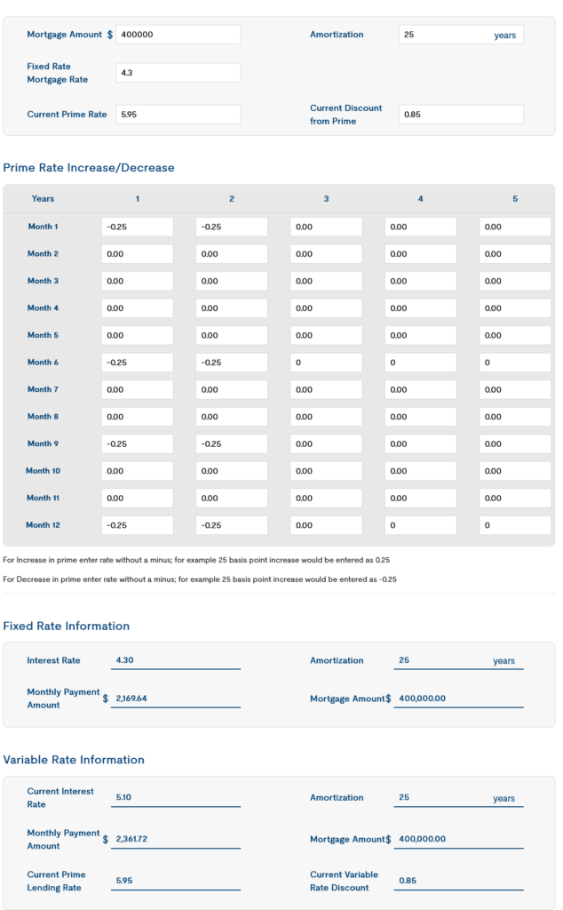 For this example, I put a 5-year term and 25-year amortization, 4.3% fixed and Prime minus 0.85% on a 25-year amortization.